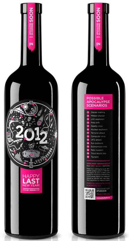 Και, τέλος, η Studiolin έχει επίσης παράγει ένα κρασί το Apocalypse 2012 ως ένα εταιρικό δώρο για τους πελάτες τους. Η εταιρεία σχεδιασμού παρέχει προσεκτικά μια λίστα από 14 πιθανά σενάρια καταστροφής- από παγετώνες που λιώνουν σε μια πιθανή εισβολή αρουραίων – στην πίσω ετικέτα!