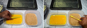 Σε ένα μπωλ χτυπάμε τα αυγά με ελάχιστο νερό. Σε ένα άλλο ανακατεύουμε όλα τα μπαχαρικά με το τυρί και τη φρυγανιά.