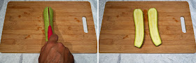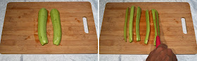 Κόβουμε τα κολοκυθάκια στη μέση κατά μήκος.